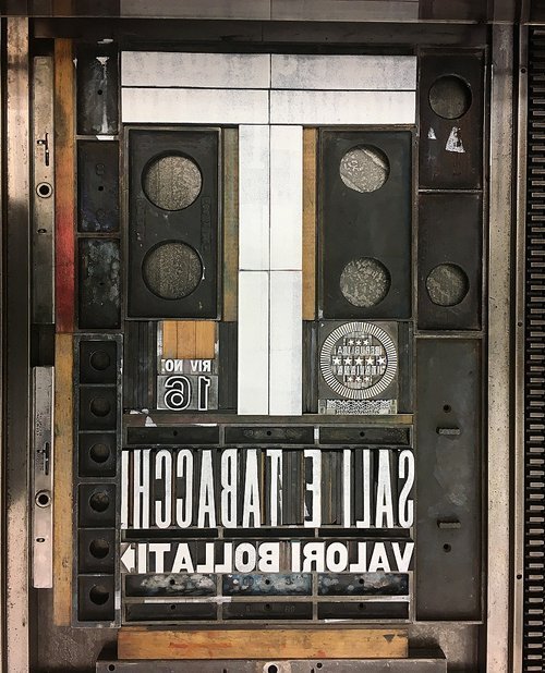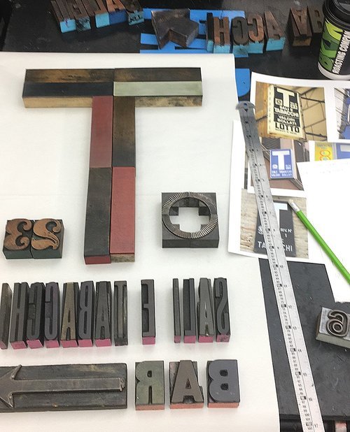 I started by collecting various wood and metal type to reflect the actual signage. Then I laid out my design on my intended poster size. I had a particularly fun time recreating the Italian Republic seal, below.